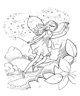 Ava turns the girls into fairies so they won’t be found themselves, but more footsteps turn out to be the second goblin, who grabs the bag in triumph. The first goblin, having evaded Peter, returns. Thinking quickly, Kirsty asks Ava to conjure a green bag of green glitter, which (as she suspected) the goblins find much more interesting. There’s a moment of worry when one goblin suggests taking both bags, but to the fairies’ relief the other goblin disagrees with him and drops Ava’s bag on the ground. Ava retrieves it and turns the girls human just in time to hide in Rachel’s pocket as Peter approaches, announcing that everyone else has been found. Back at camp, Ava thanks the girls and treats all the campers to a spectacular, colourful sunset on her way back to Fairyland.