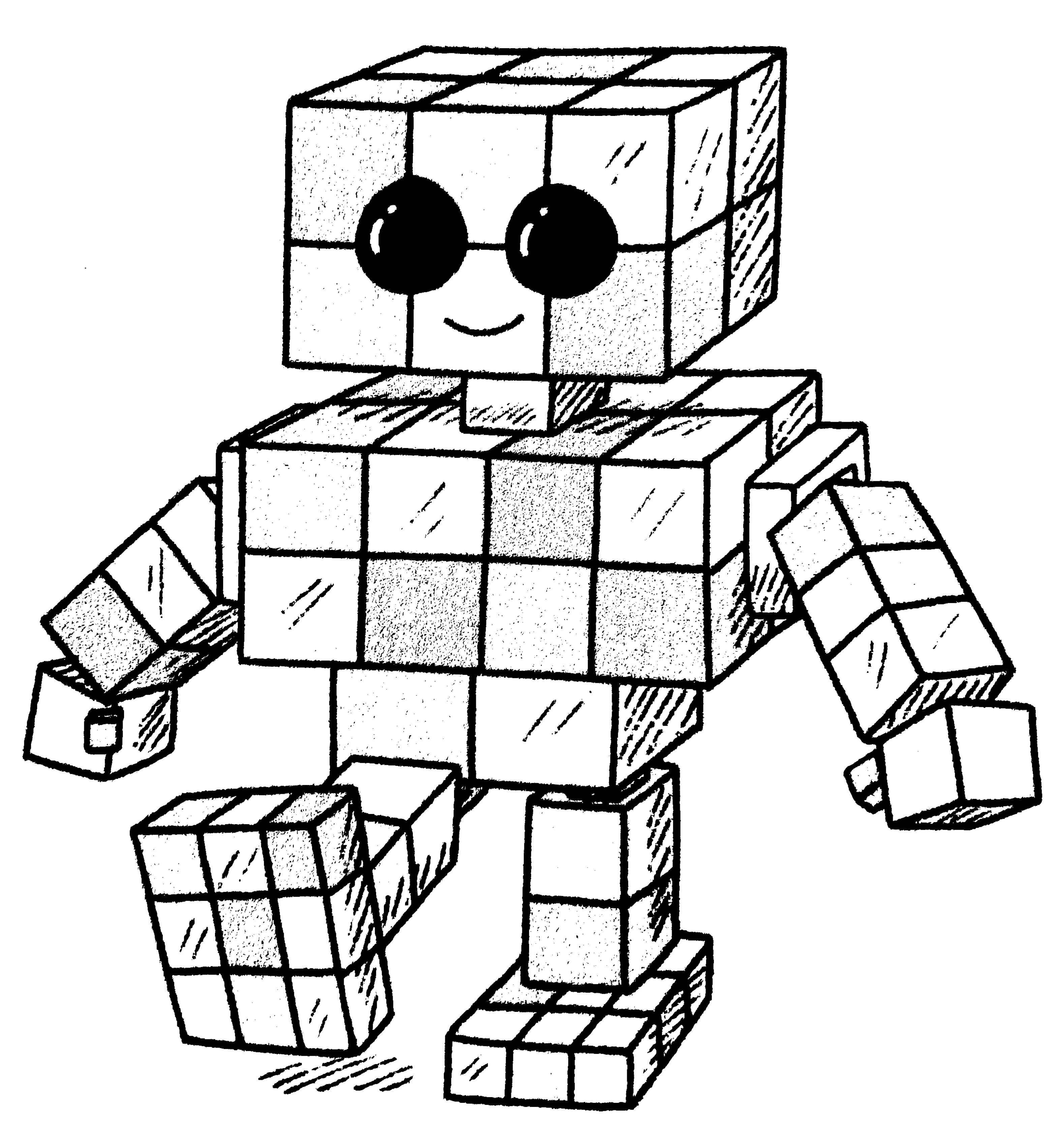 Blocky is a robot made of small cubes. He is humanoid, but with a rectangular head and large black eyes.