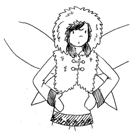 Carrie has a furry, mint-green hood over light brown hair put into bunches. She wears a mint-green body warmer over a woolly jumper, dark blue jeans tucked into pale brown furry boots, and mint-green mittens. Her wings are pointed and turquoise-tinted.