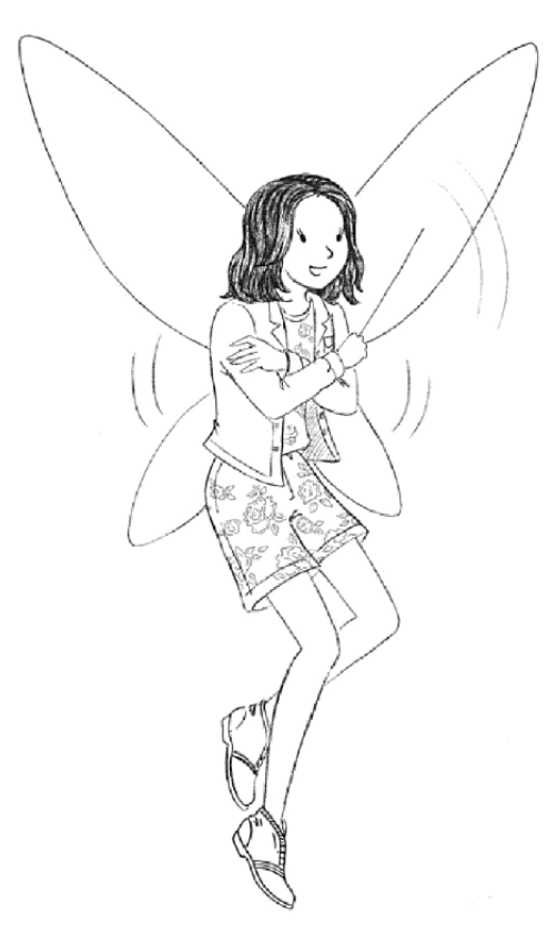 Clare has shoulder-length red hair. She wears a denim jacket over a white playsuit printed with red roses and brown ankle boots. Her wings are round-pointed and red-tinted.