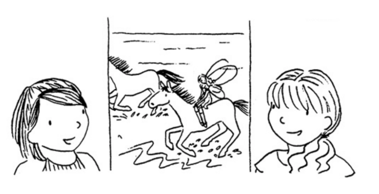 The girls notice that the seven horses are all colours of the rainbow and on the painted center pole more rainbow horses run along a beach. When the merry-go-round stops, the girls climb onto the last two horses with Kirsty on “Indigo Princess” and Rachel on “Prancing Violet”. The ride feels as if they’re riding the real horses in the painting and when the horses stop again the girls begin searching for Heather the Violet Fairy, who turns out to be riding the violet horse in the painting. Tom Goodfellow directs the other children to a clown show and Kirsty pulls a little golden paintbrush from her magic bag. Curious, she pokes at the painting, bringing a puff of violet fairy dust, then begins brushing all over the painting of Heather, lifting her right off the pole. The girls introduce themselves and tell Heather her sisters are all safe in the pot under the willow tree and bring her there right away, with Kirsty carrying Heather.