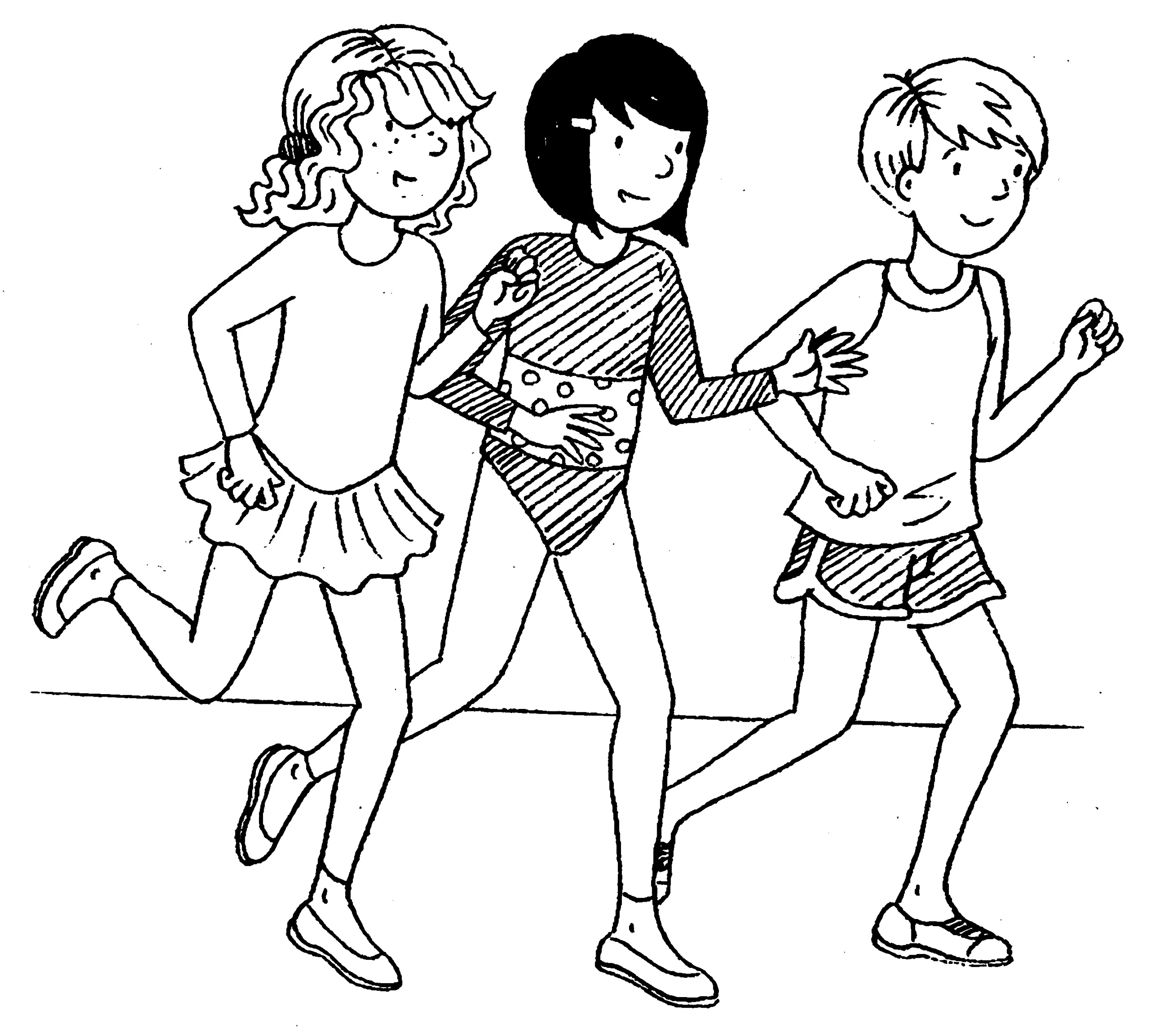 All three are children who appear wearing acrobatic outfits. Josie is blonde, with wavy hair that falls just below her shoulders and tied with a scrunchie. She wears a leotard with a built-in gauzy skirt, paired with leggings and plimsolls. Maya has dark straight hair, cut to a bob and held back with a clip. She wears a dark-coloured leotard with a polka dot band in the middle, along with leggings and plimsolls. Dylan has blonde short hair and wears a loose tank and shorts. He wears trainers.