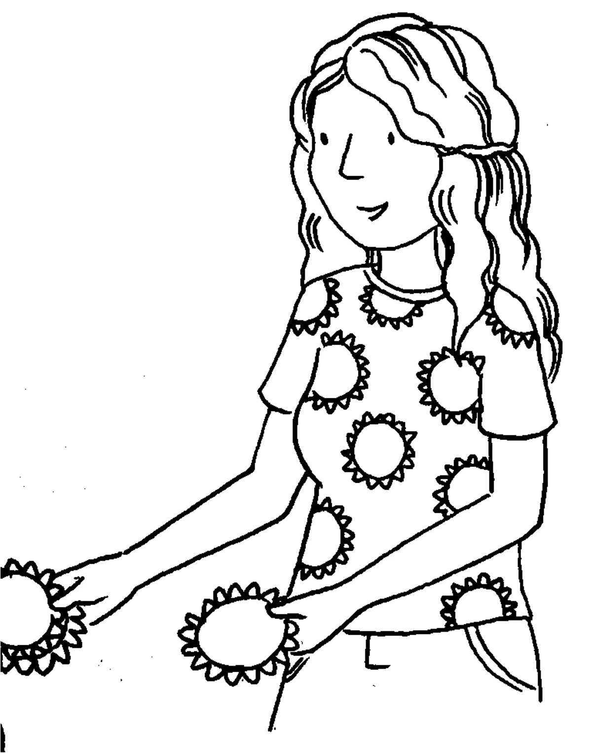 Laura is a young, white woman. She has long, wavy light hair and wears a bright green t-shirt with sunflowers on it, paired with jeans.