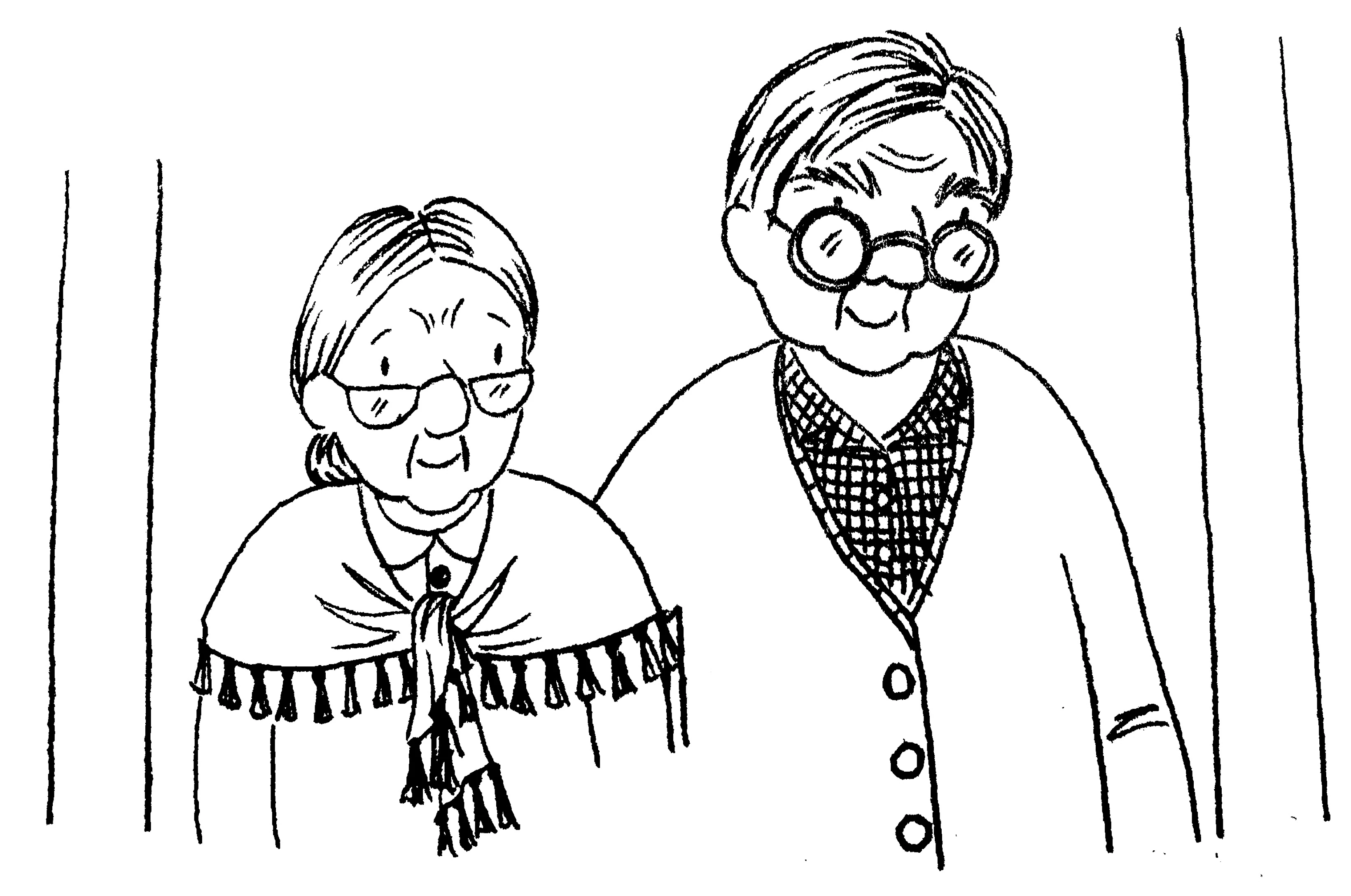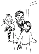 The Twitchings are both elderly with grey hair and glasses. Mrs Twitching is shorter than her husband and wears her hair in a low bun. Her glasses are half-moon shaped and she wears a top with a rounded collar and a shawl with tassels around her shoulders. Mr Twitching has short, straight hair and round glasses. He wears a checkered collared shirt and a button down cardigan.