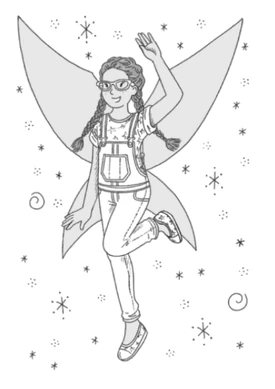 Niamh has long ginger hair in two plaits with green glasses. She wears a purple t-shirt scattered with gold stars underneath denim dungarees and purple and white starry shoes. Her wings are pointy and green tinted.