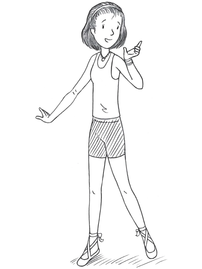 She has short brown hair swept back by a headband. She is dressed in a leotard, practice shorts and ballet shoes. In a practice routine, she is seen wearing a tutu.