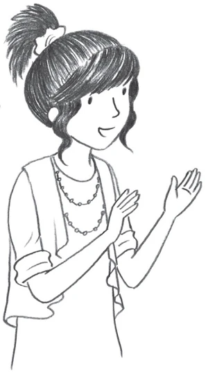 Poppy has black hair tied in a pony tail with a fringe and two strands of hair either side. She wears a cardigan and a tunic. She also wears necklaces and sandals.