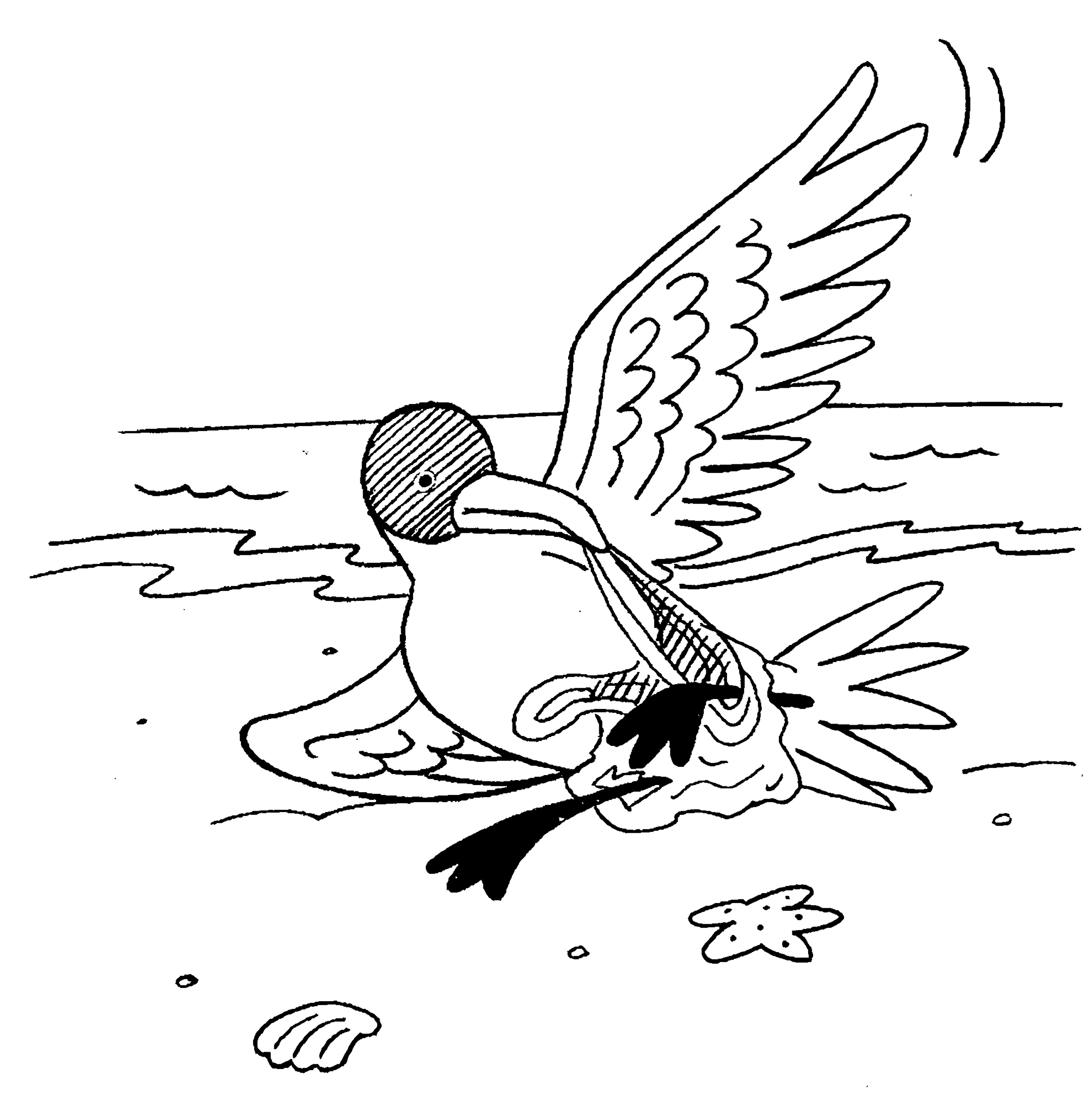 Screech is a typical seagull, with a white feathered body and a grey head.