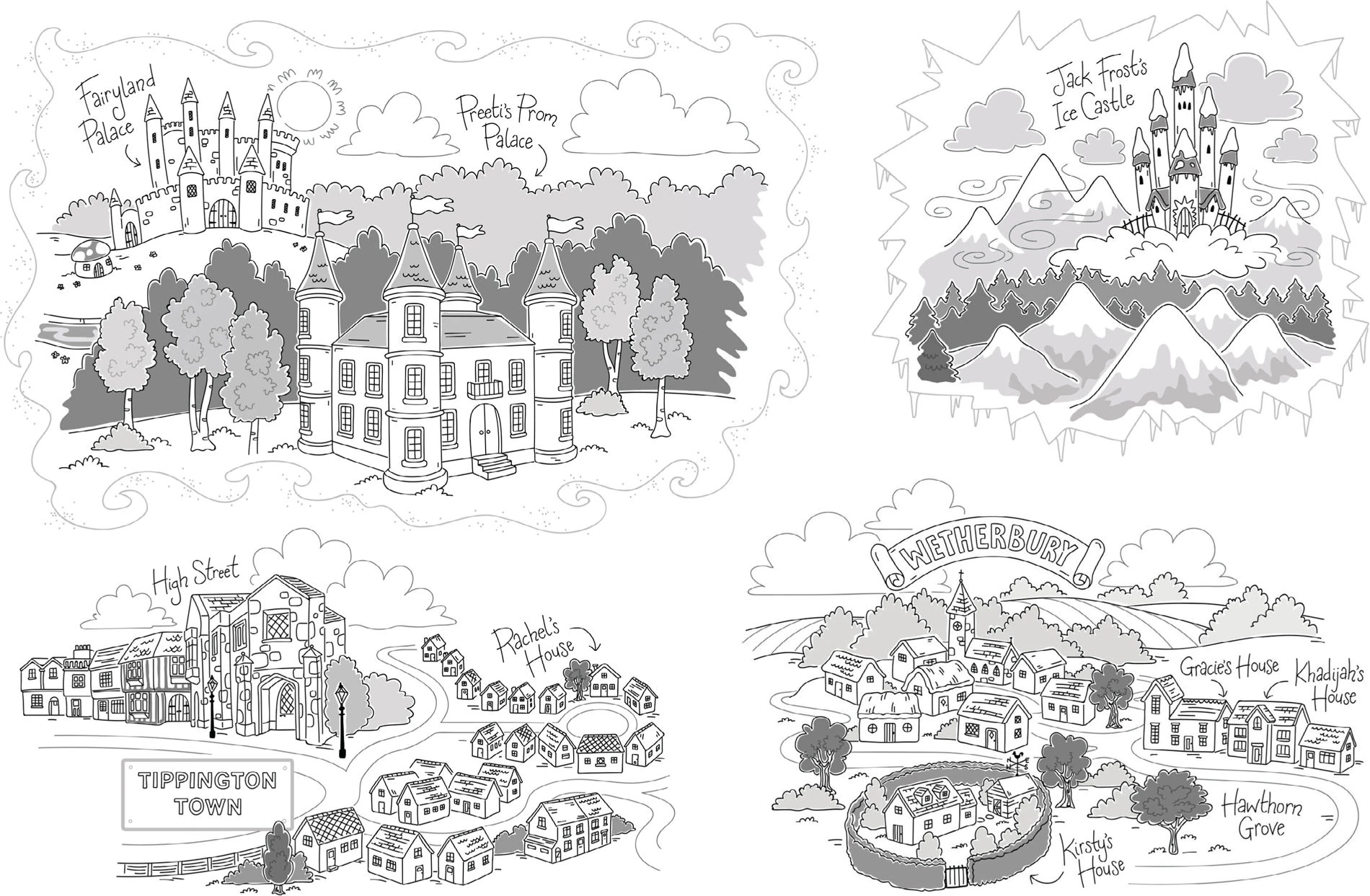 Castle Springs Ballet School and Tip-Top Castle lie on the edge of Tippington. As well as the castle, there is Tippington Manor, which has an adventure playground with a big slide and a treehouse. The town has a Clock Tower, a botanical garden as well as a beautiful Japanese garden. There is a 'haunted' house where the community Halloween party was held. Hillfields Farm is a Christmas tree farm.