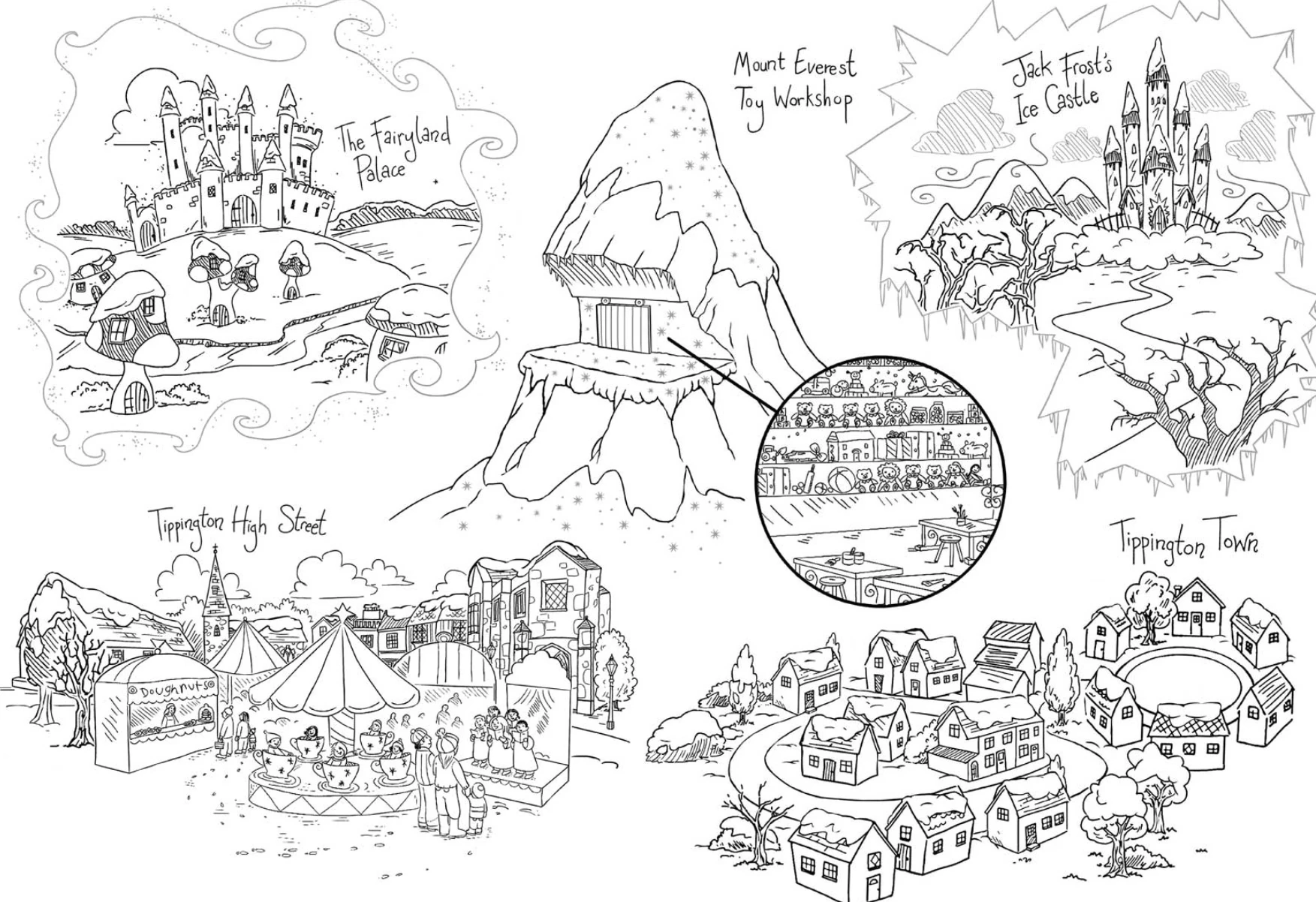 Shops consist of the Tippington Bookshop, a costume shop, Tall Toy Store (with four floors), Fashion Fun, Fabulous Flowers, Dancing Days and the Bakery. Tippington has a little cinema and a dental surgery. Specific roads consist of Tippington High Street, Twisty Alley and Tippington Lane, a cul-de-sac.