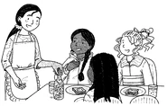 Khadijah, Gracie, and Rachel come across the waitress working in the Treasure Pot Café. They note she is not much older than them, and she explains that her mum owns the café and she works there over the holidays. They collect fun things from the lake and display them in the café. She has found the bottle which the girls know contains Yasmeen. Three goblins are also at the café and they are being very rude to the waitress, so the girls are being especially nice. Khadijah asks to have a look at the bottle, and she gives it to them, wondering if they'll be able to uncork it. They use some fairy magic to do so, and return the opened bottle before they leave.