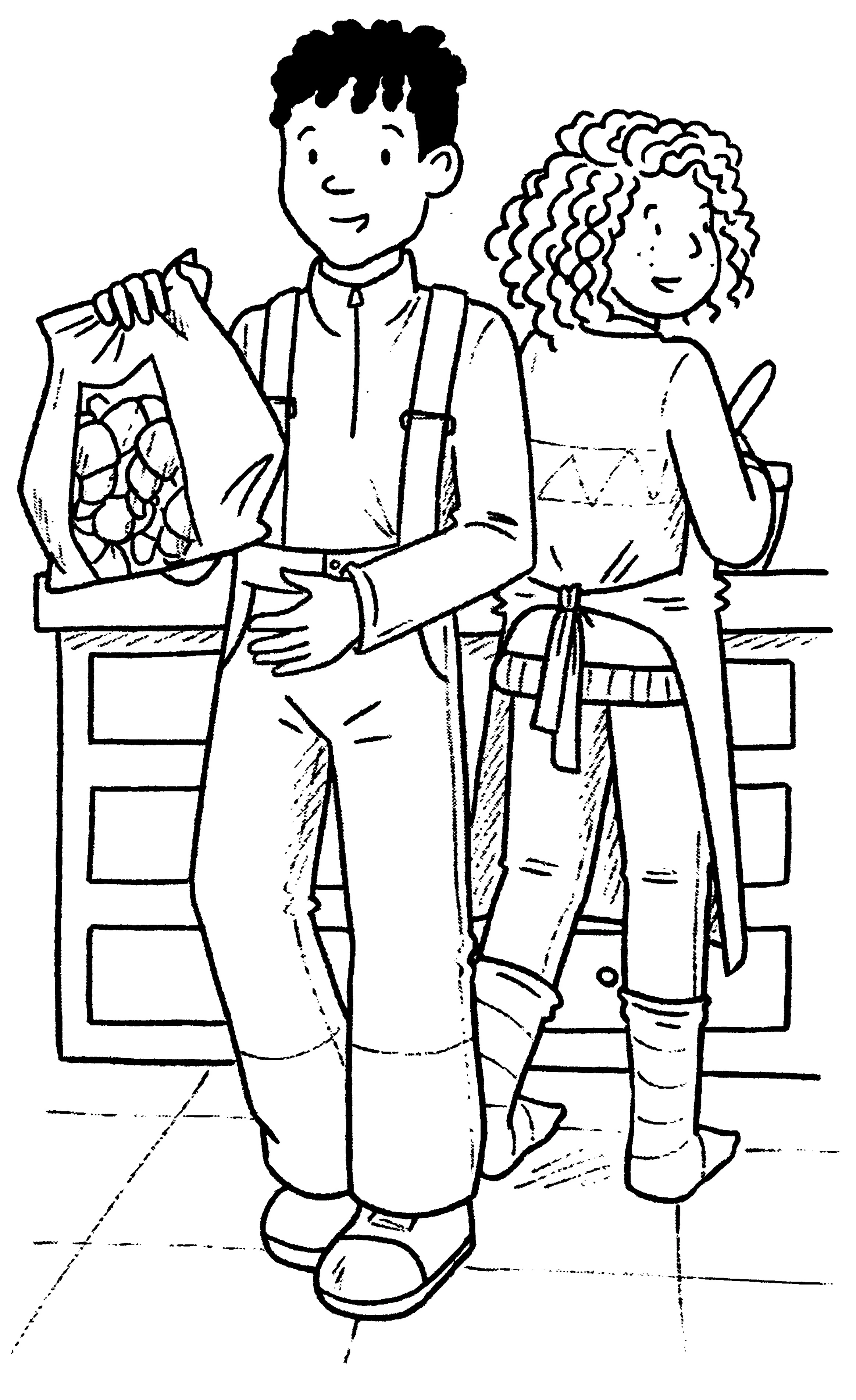 Ty and Kim are both young. Ty has black hair which appears to be in a locs or twists style. He is seen wearing ski gear. Kim has light-coloured curly hair which falls just above her shoulders. She is seen wearing jeans, a knitted jumper, and a white apron.