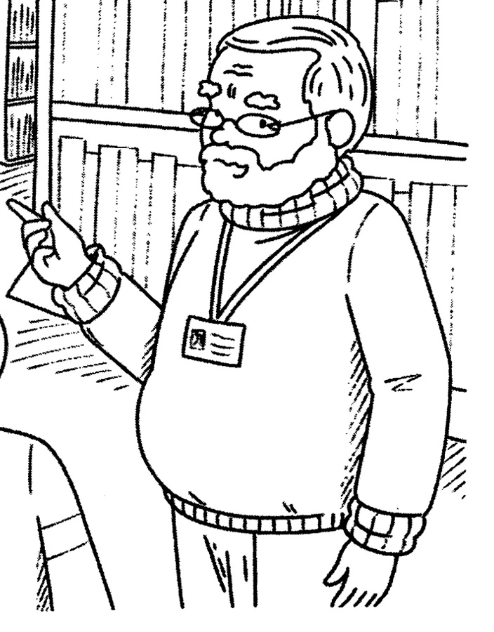 The museum's librarian is an older man with a round face, a beard and bushy eyebrows. He wears oval-shaped glasses, a cosy turtleneck and an ID badge on a lanyard.